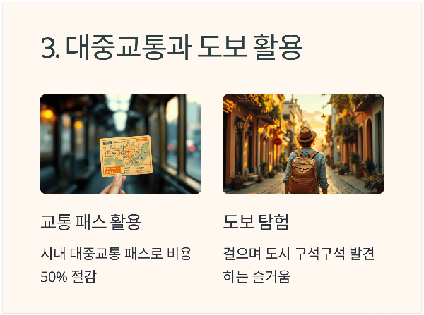 현지 교통수단을 이해하고 활용하는 것은 여행 비용을 크게 줄이는 방법입니다. 특히 대도시에서는 대중교통이 잘 발달해 있습니다.