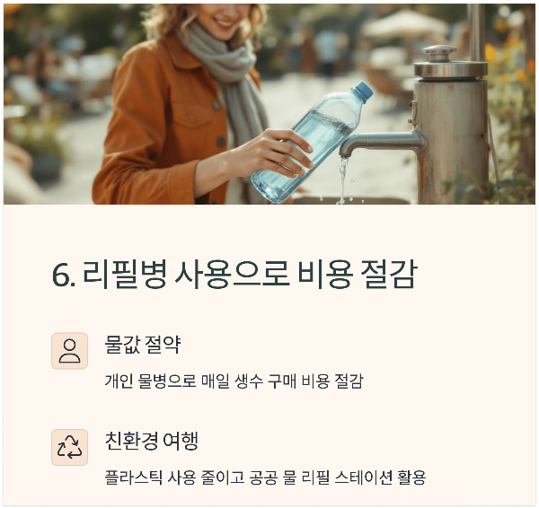 일회용 물병 구매는 작지만 여행 기간 동안 누적되면 상당한 비용이 됩니다. 환경에도 좋은 습관을 들여보세요.