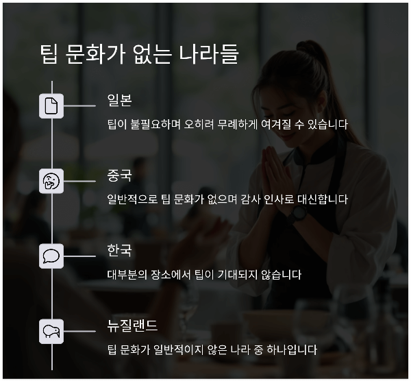 일부 국가에서는 팁이 오히려 불편함이나 오해를 줄 수 있습니다. 팁 문화가 없거나 미미한 국가에서의 올바른 대처법을 알아봅시다.