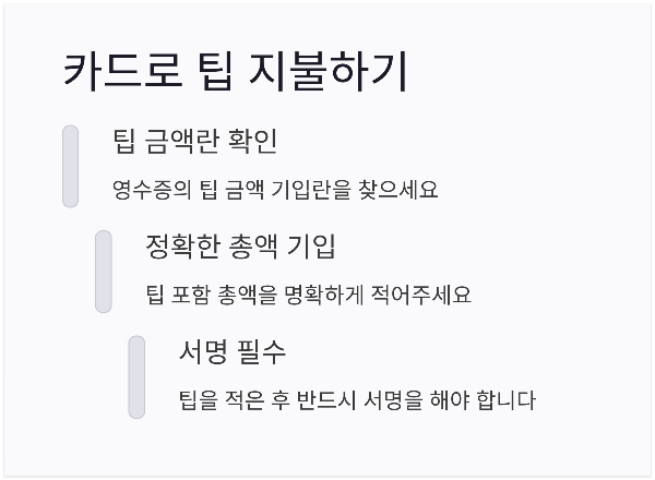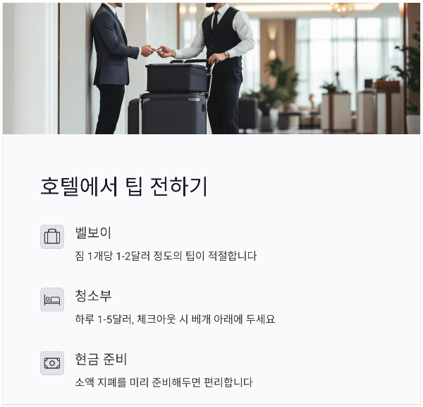 - 현금 부족 시: 카드 팁 가능 여부 확인