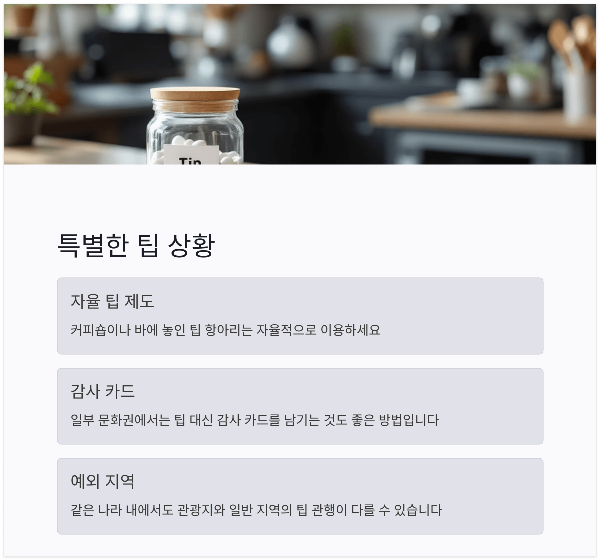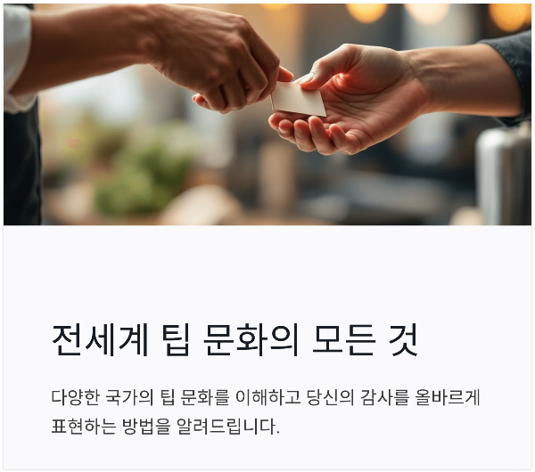 - 일본/한국: 팁 문화 없음, 고품질 서비스 기본 제공