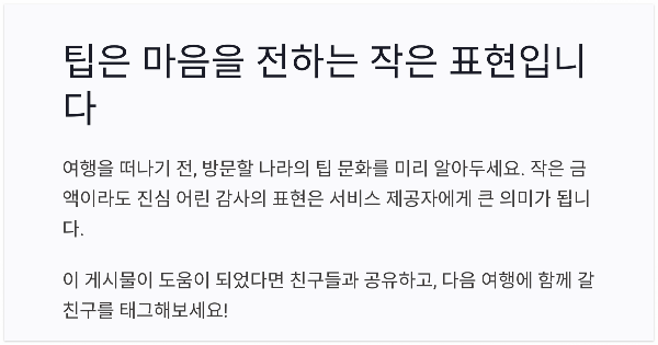 - 전체 여행 예산의 5~10%를 팁으로 계획