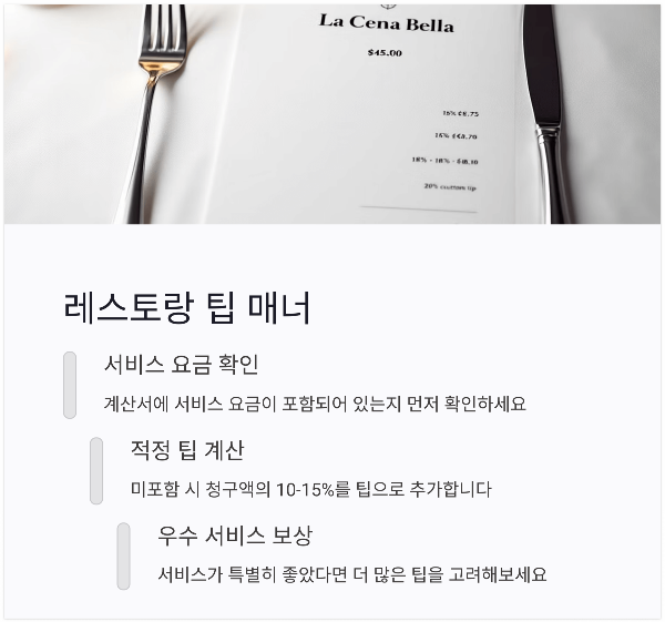 - 언어 장벽: 팁 금액 메모 또는 계산기 활용
