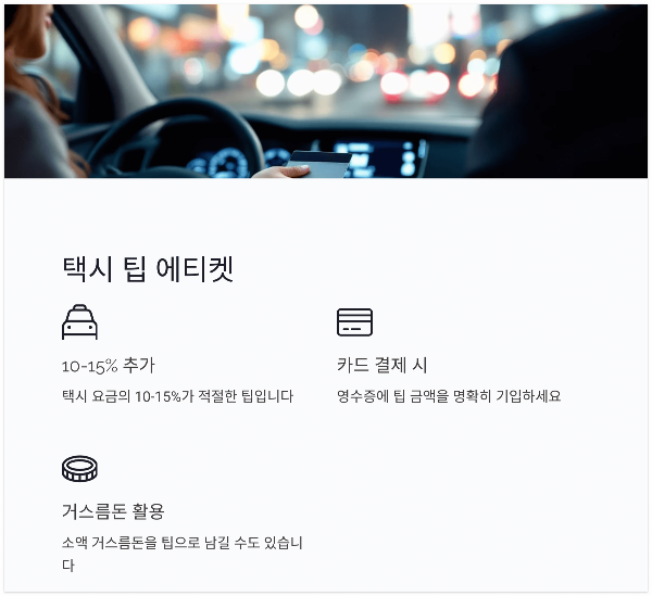 - 우버/리프트 등 차량공유 서비스: 앱 내 팁 기능 활용
