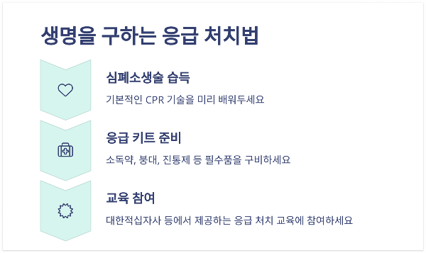 다양한 응급 상황은 즉각적인 대처가 필요합니다. 상황별 핵심 대처법을 알아봅시다: