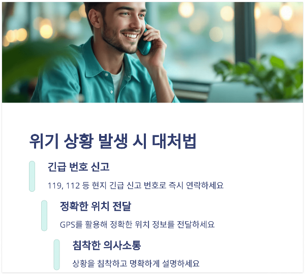 위기 상황에서는 침착함을 유지하고, 신속한 의사결정과 정확한 정보 전달로 대응하세요. 이러한 준비와 대처로 소중한 생명과 여행의 즐거움을 지킬 수 있습니다.